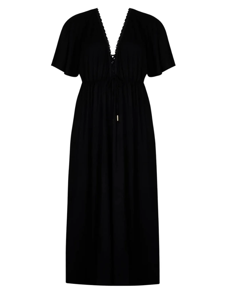 Caftan long Antigel La Modeuse : Ce modèle raffiné présente un profond décolleté en V avec laçage ajustable à l’avant. Les fentes sur les côtés offrent une allure élégante, sublimée par une passementerie faite à la main. Idéal pour un look chic et sophistiqué.