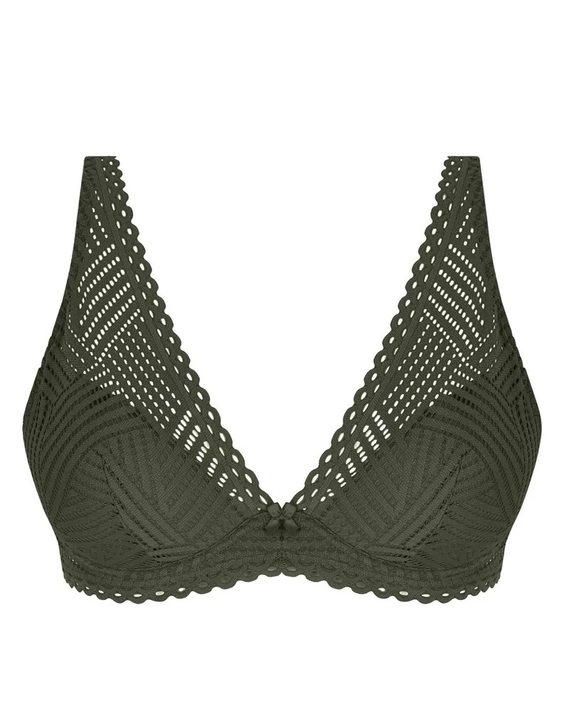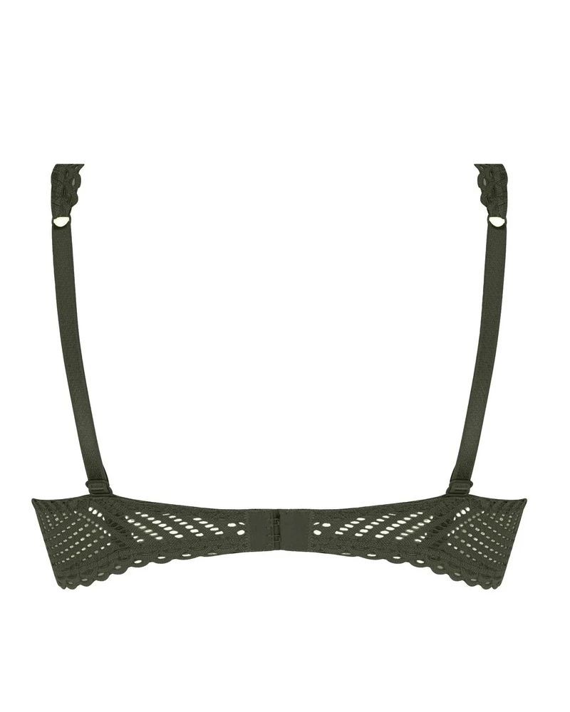 Le soutien-gorge plunge demi mousse Antigel de la collection Tressage Graphic propose une forme foulard confortable et légère qui assure un réel maintien de la poitrine. Son décolleté plongeant et sa dentelle Jacquard offrent un look ultra moderne et féminin.