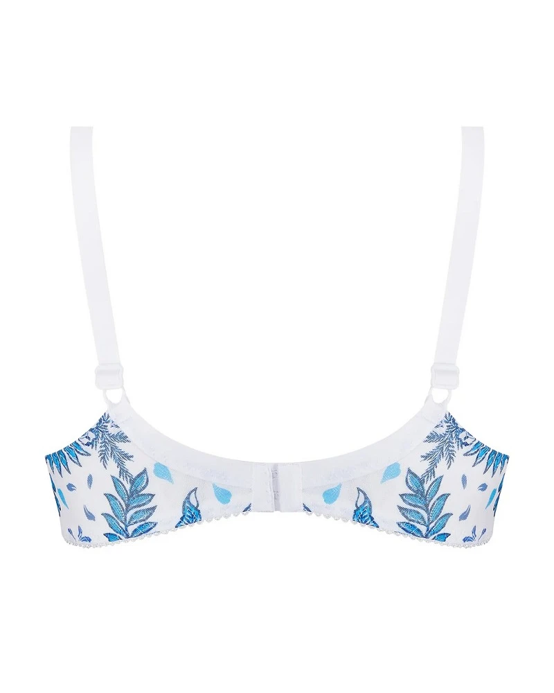 Le soutien-gorge triangle Antigel Patio Fraîcheur Bleu Azul allie légèreté et soutien grâce à ses armatures et son tulle imprimé. Subtillement orné d’un galon de dentelle et d’un nœud à l’entregorge, il apporte une touche d’élégance.